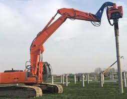 This is an excavator equipped with a vibratory pile driver attachment, which is used for installing or extracting piles in construction projects.